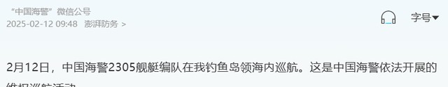 2月12日,中国海警2305舰艇编队在钓鱼岛领海内巡航。这个消息,简短,却强烈传递出一个信号:钓鱼岛,永远是中国的。