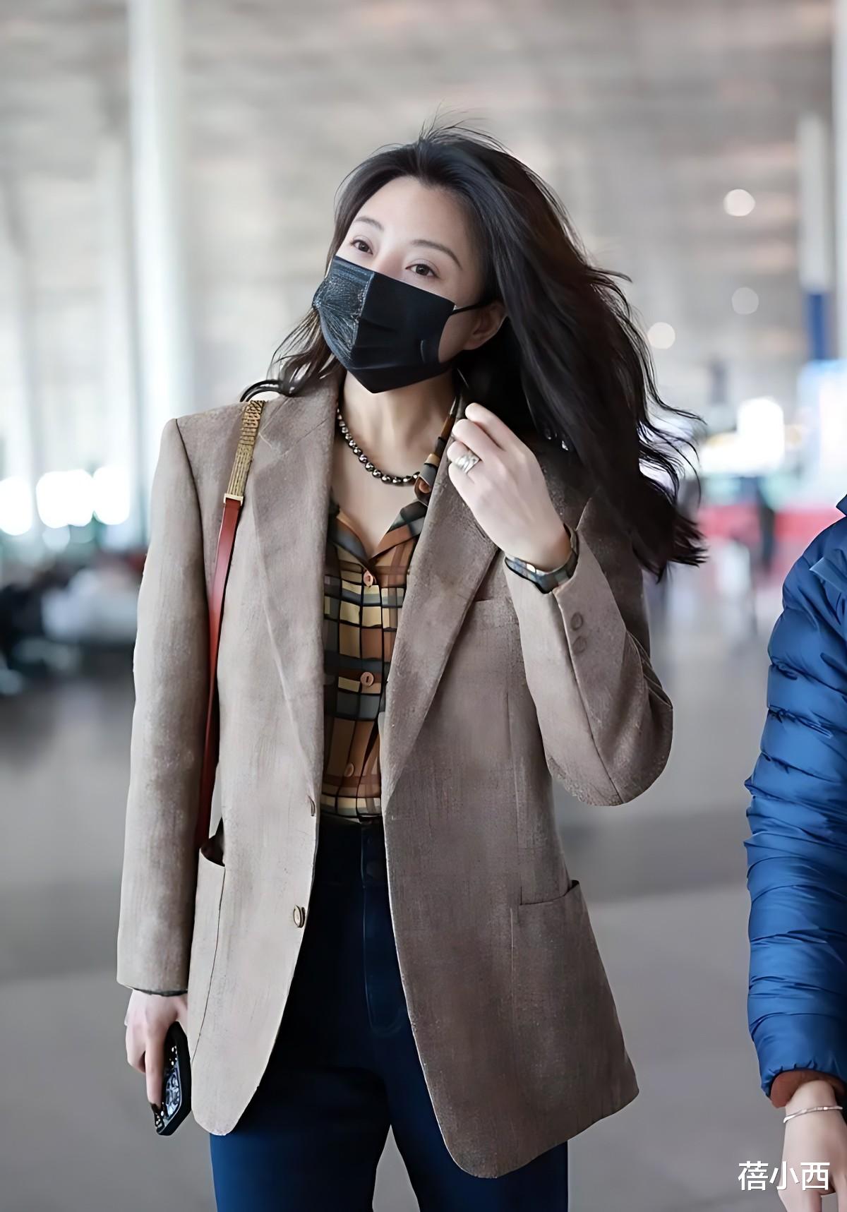 谁说40+女性不能驾驭“飒爽风”?殷桃用卡其色西装搭配深蓝色阔腿牛仔裤和格纹衬衫,就将干练与柔美完美融合起来。卡其色西装是秋冬季节的百搭单品,宽松的版型对身材包容性极强,还能营造出“大女人风”的随性飒爽,走路带风。