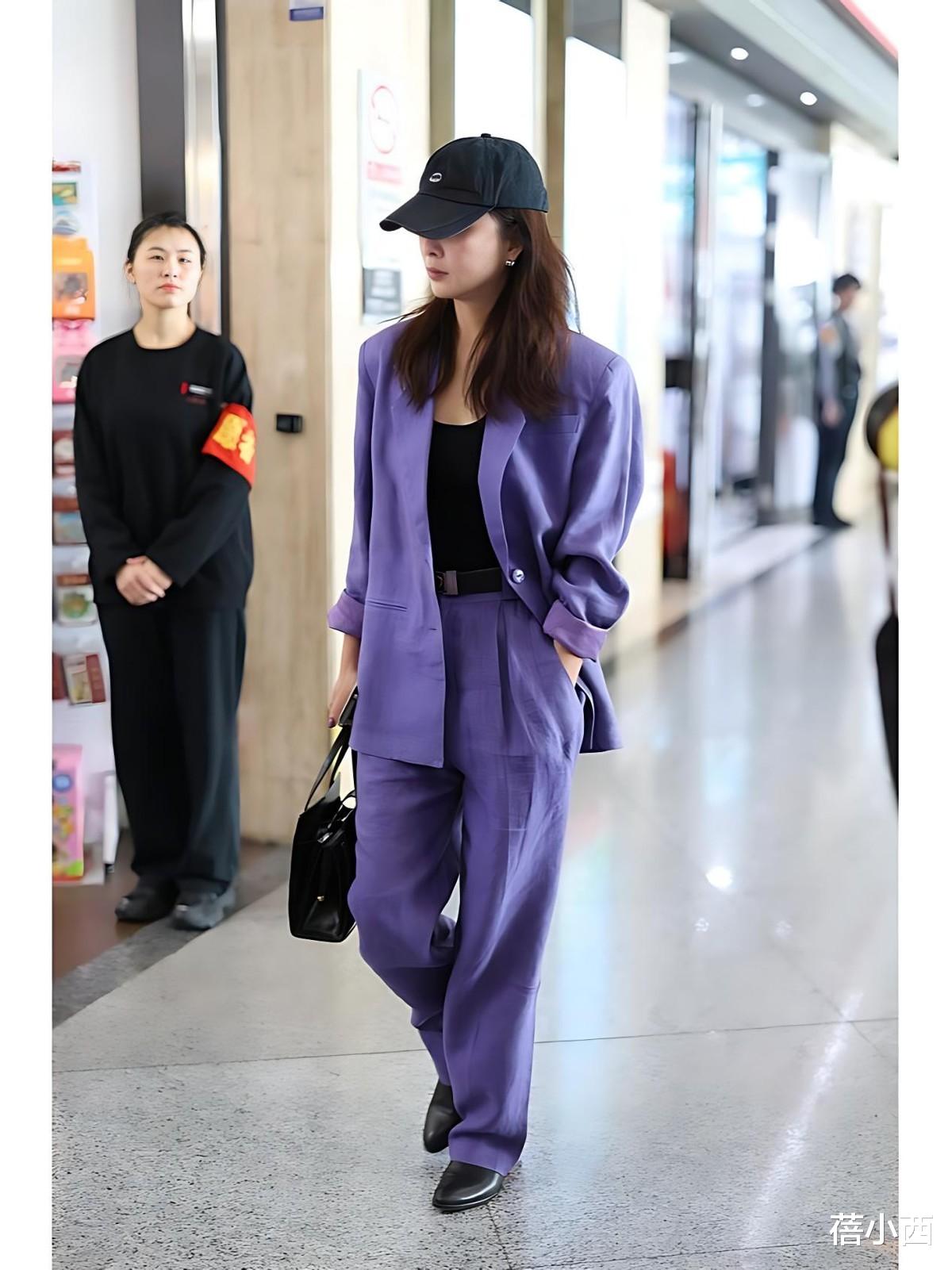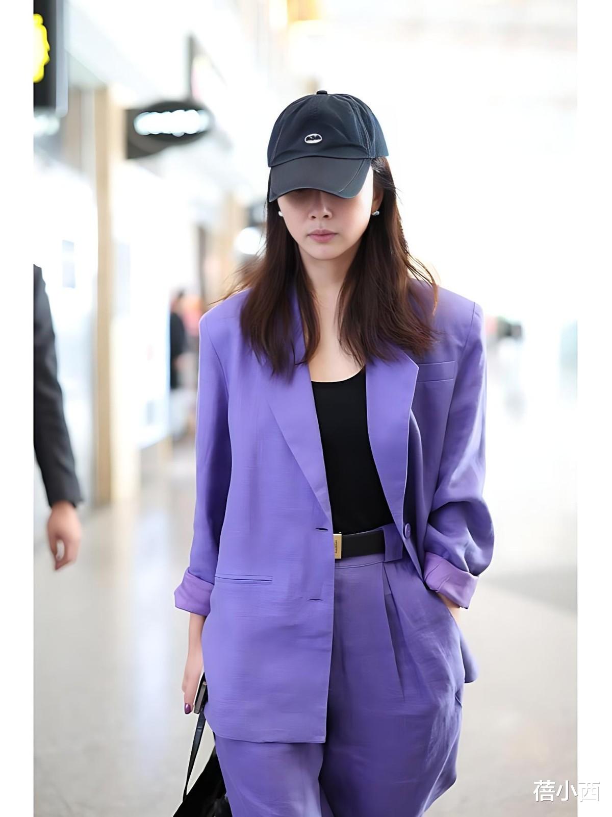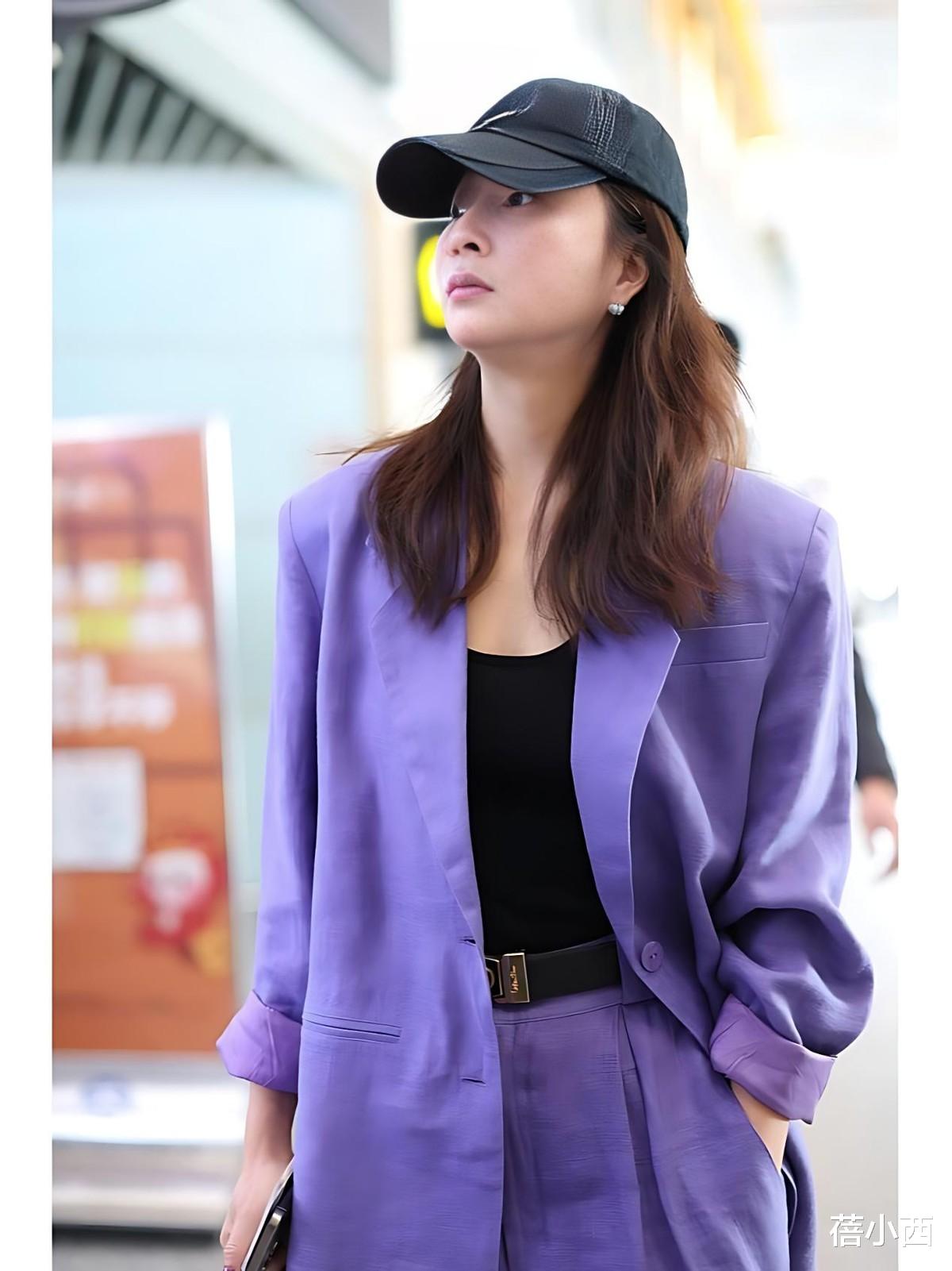 殷桃在机场的这套紫色西装套装搭配黑色棒球帽,则把复古与摩登玩出了新高度。紫色是极具个性的色彩,一般人很难驾驭,但殷桃穿着却一点儿不突兀。宽松版型的西装套装也弱化了职场套装的刻板印象,亚麻质感的面料自带随性慵懒的氛围,非常适合40+女性打造“不费力的时髦”。