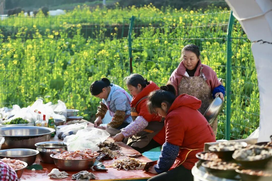 十二点刚过,坝坝宴正式开席。凉菜是烤鸭(邹家姑姑赞助的)、猪耳朵,热菜陆续上——烧白、夹沙肉、粉蒸排骨,最后是一大盆萝卜炖排骨。酒是邹记福存了多年的老酒,菜是邹小平头天去镇上买的,乐队是邹继兵请来的,家宴开席前,先让咱们把气氛热闹起来。红红火火的长扇,舞出咱们邹家的精气神!
