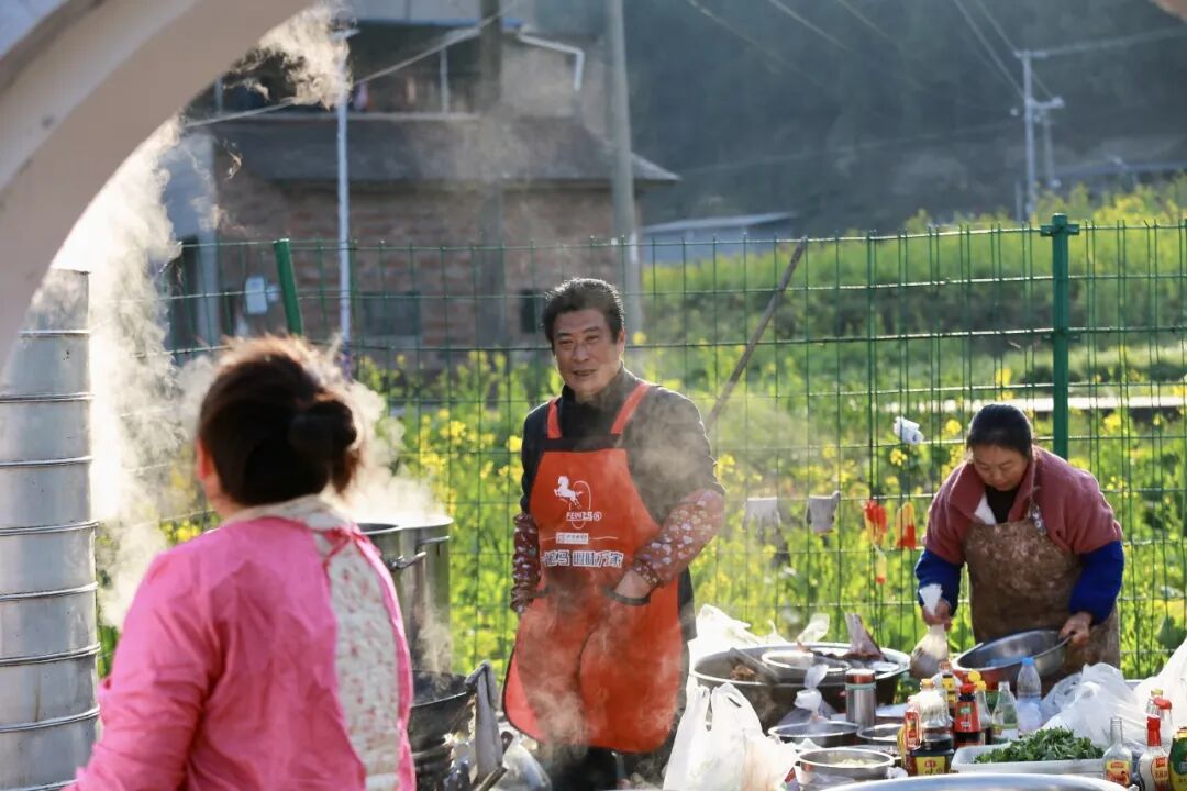 老宅的灶膛里柴火烧得正旺,几口大铁锅冒着热气。锅里炖的是萝卜,自家地里的,和排骨一起咕嘟咕嘟响。有早到的宗亲凑过去看,掌勺的大嫂用锅铲指了指角落:“茶在那儿,自己倒。”