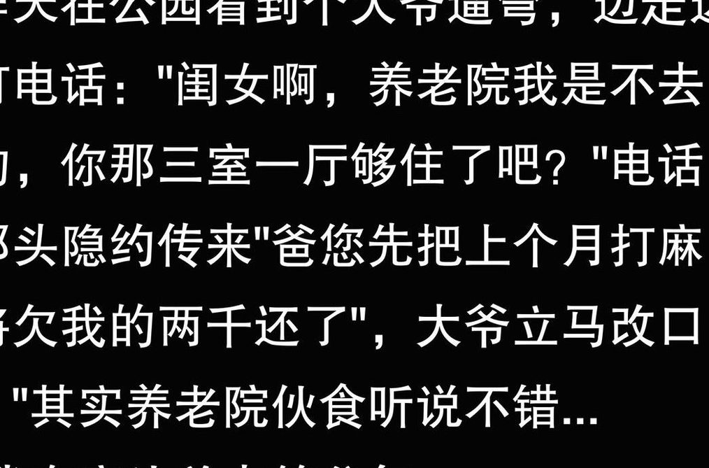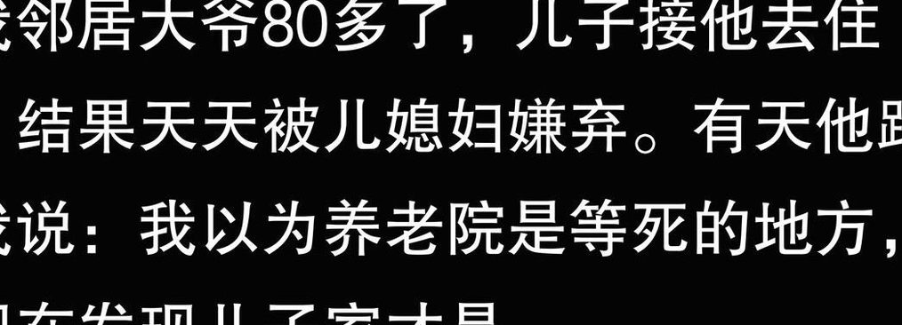 回家的路上,儿子告诉我,他出差回来才知道李芳把我送到了养老院,两人大吵了一架。 李芳嫌我在家影响她的生活品质 ,趁儿子不在家,偷偷把我送走了。