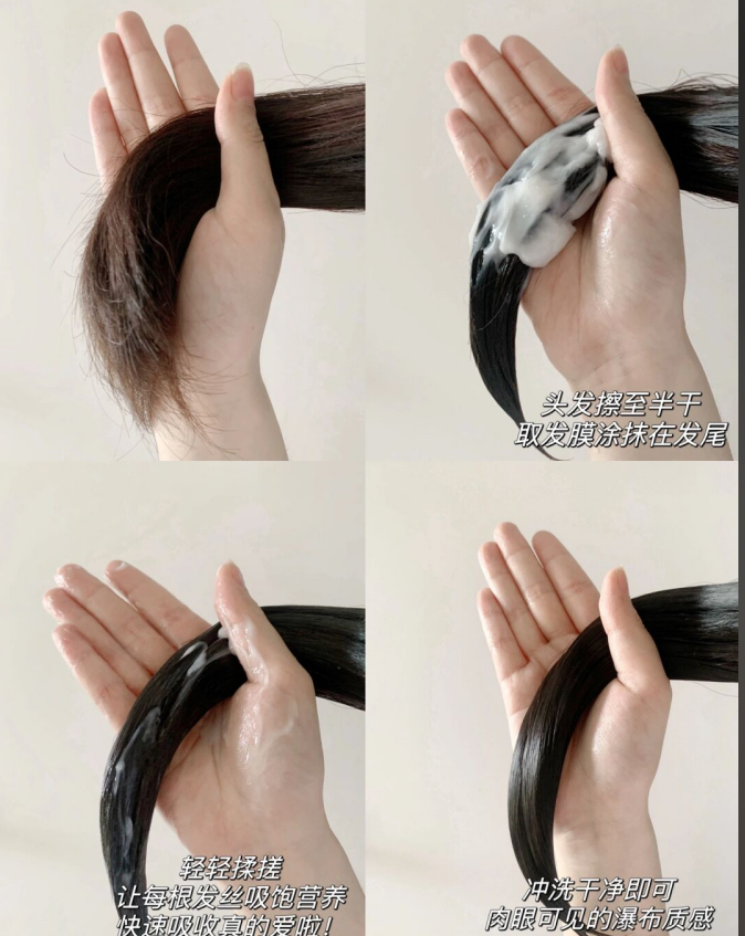 3、吸收速度很重要好的发膜抹上几分钟就能感觉头发在“吃”进去,冲洗后不会假滑或残留膜感。如果冲半天还是腻乎乎的,大概率是硅油加太多。