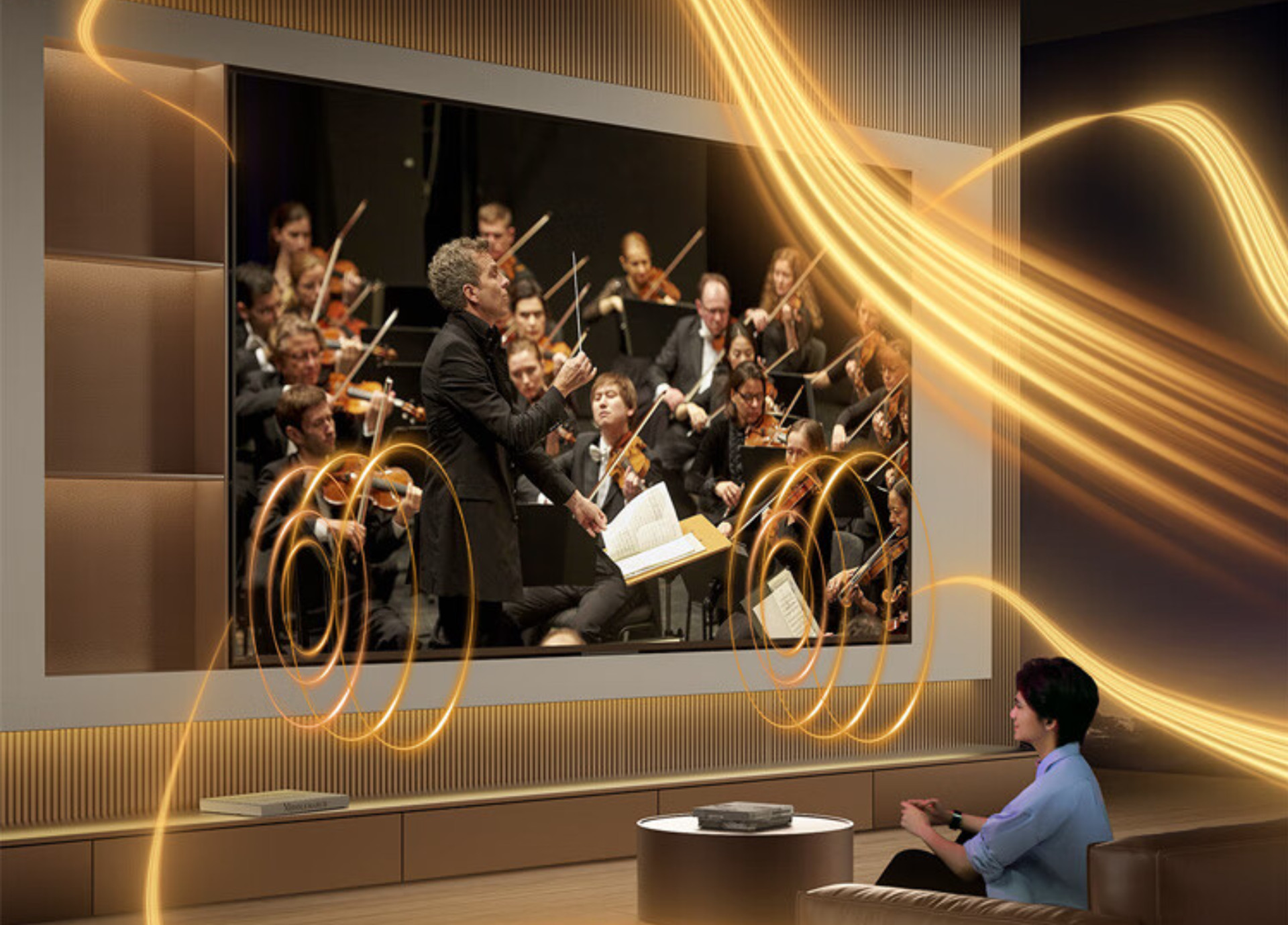 在音效方面,它内置 4.2 声道回音壁,额定功率 70W,峰值功率高达 200W ,配备 15 颗高品质声学单元,构建 7.1.2 杜比全景声环绕声效 。黑胶重低音与双被动振膜设计,释放强劲低频能量,顶部天空声道与环绕高音单元协同,精准捕捉声音细节,还原三维沉浸声场,让客厅秒变私享 IMAX 影院 。