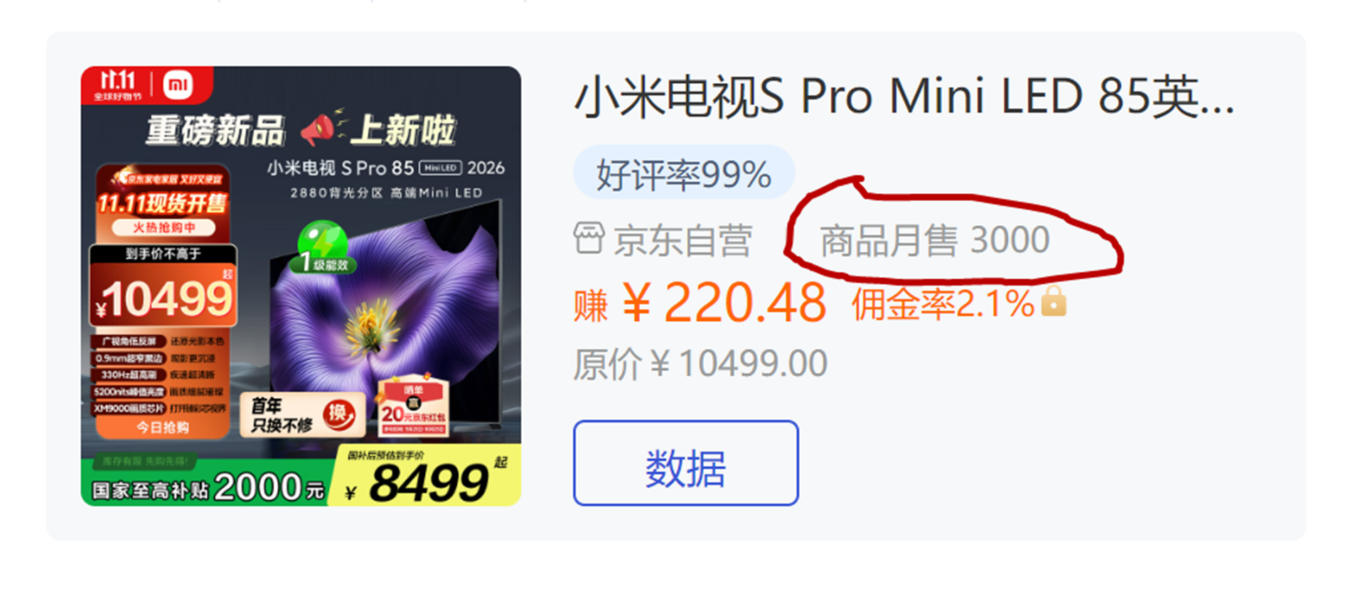 小米电视 S Pro Mini LED 85 英寸 2026 款适合追求高性价比、喜欢小米生态产品的用户 。如果你家中有很多小米智能设备,那么这款电视可以与它们更好地联动,打造智能化的家居环境 。它丰富的接口和多屏协同功能,也能满足用户多样化的使用需求,无论是连接游戏主机、电脑还是其他设备,都非常方便 。其月销量超3000台,是当下最受欢迎的大屏电视之一。