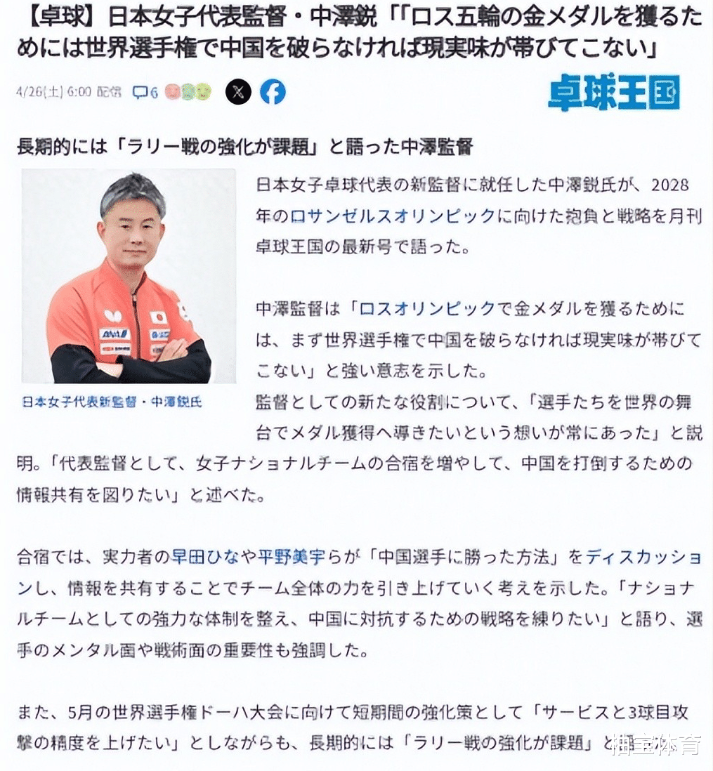 在今天,原河北人的王锐,现任日乒任教练,他表示:要在世乒赛击败中国乒乓!不否认现在乒坛仅次于国乒实力的就是日乒,她们一直以来都将击败中国乒乓为目的,想要在各种比赛中拿到冠军。这位教练在今天的发文中也表示:组织早田希娜、平野美宇等主力研讨战胜中国乒乓选手的方法、重点提升发球与第三板攻击精度,长期课题依然是加强相持球能力。