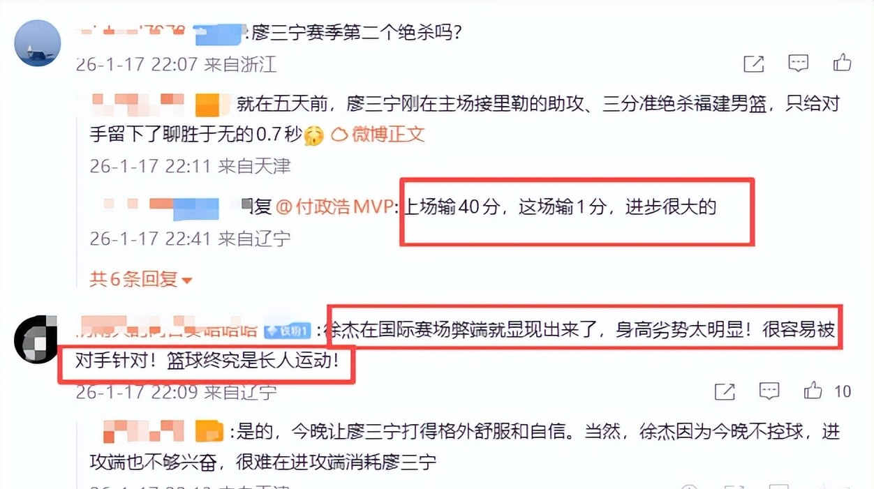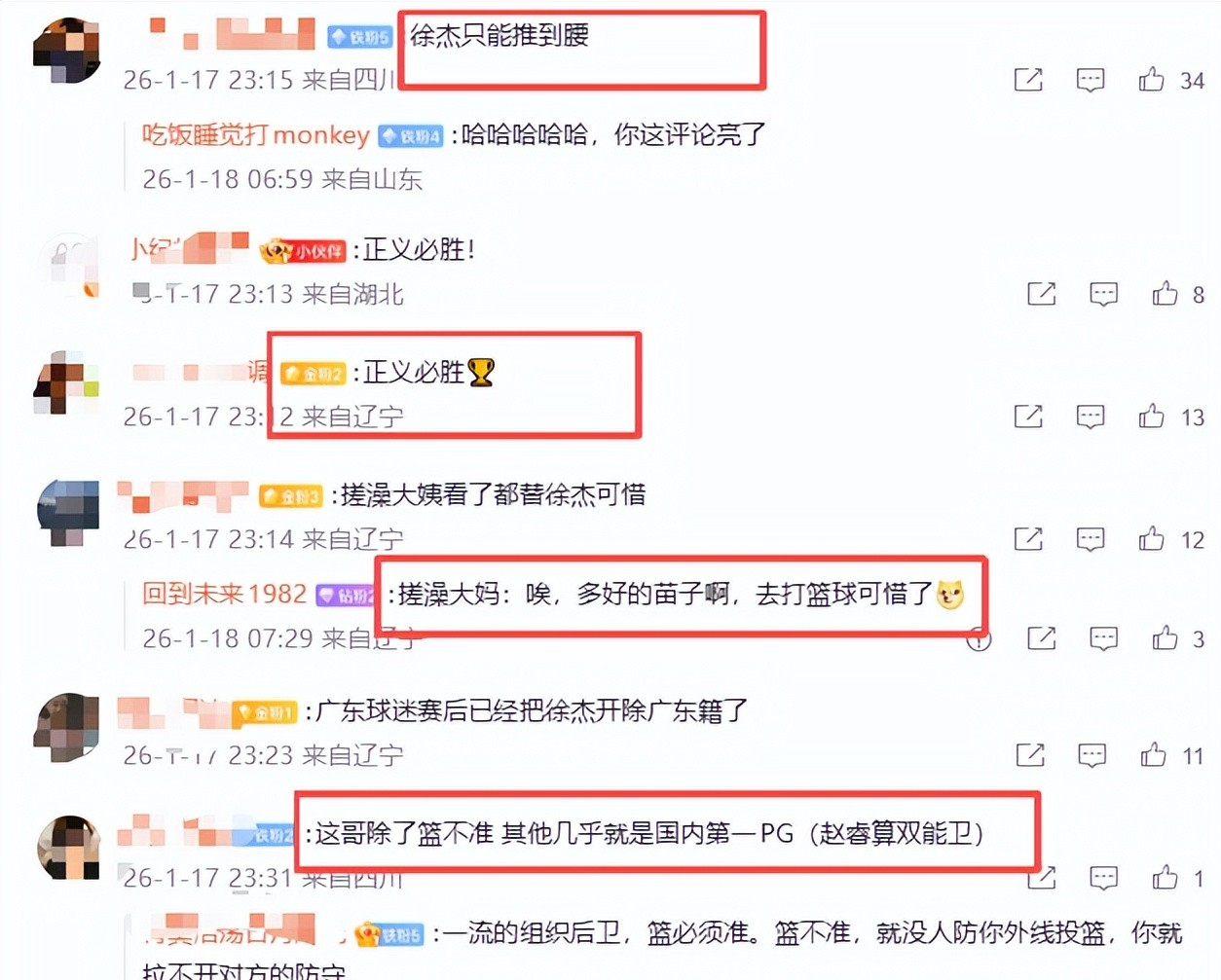 这组评论更夸张,网友直接说徐杰只能推到腰,还有辽宁网友说正义必胜,搓澡大妈说徐杰不适合打球,跟我学搓澡吧!还有说廖三宁如果投篮准的话就是国内第一空位!
