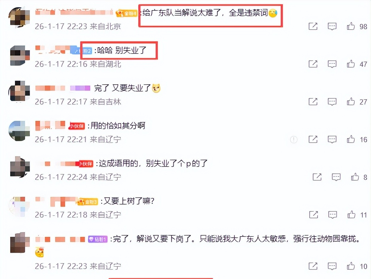 网友直接评论:给广东当解说员太难了,全都是违禁词!希望这个解说员不要失业。