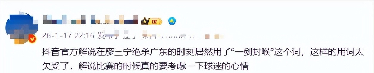 赛后,国内资深媒体人发文:抖音官网解说员在廖三宁完场绝杀后用了“一剑封喉”这个词,这样用词不太好!