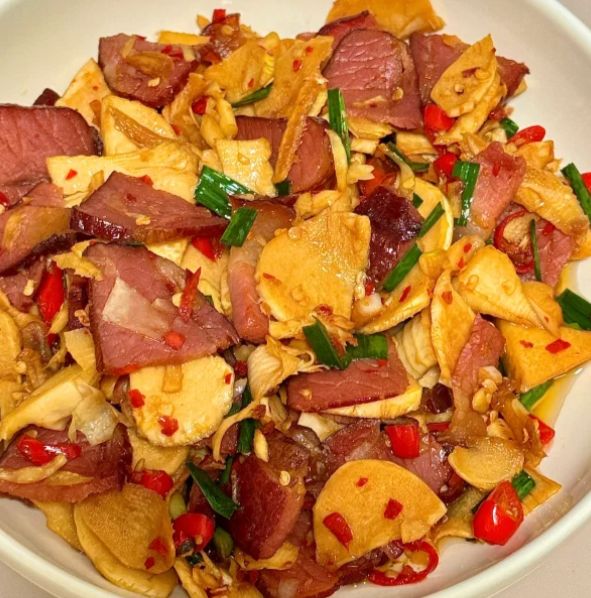 冬日里,湘西的灶火总是暖得格外慢,却也暖得格外深。火光摇曳间,悬在房梁上的腊肉早已被时光熏染成深沉的赭色,油脂悄然凝结,凝住了一整年的山野气息。而在不远处的竹林里,冬笋正悄悄拱开覆雪的土地,积蓄着清甜的鲜嫩。这两样寻常的山间风物,一旦在铁锅中相遇,便能碰撞出湘西冬日里最令人惦念的滋味——腊肉炒冬笋。那不仅是盘中餐,更是山风与烟火共酿的一首暖歌。