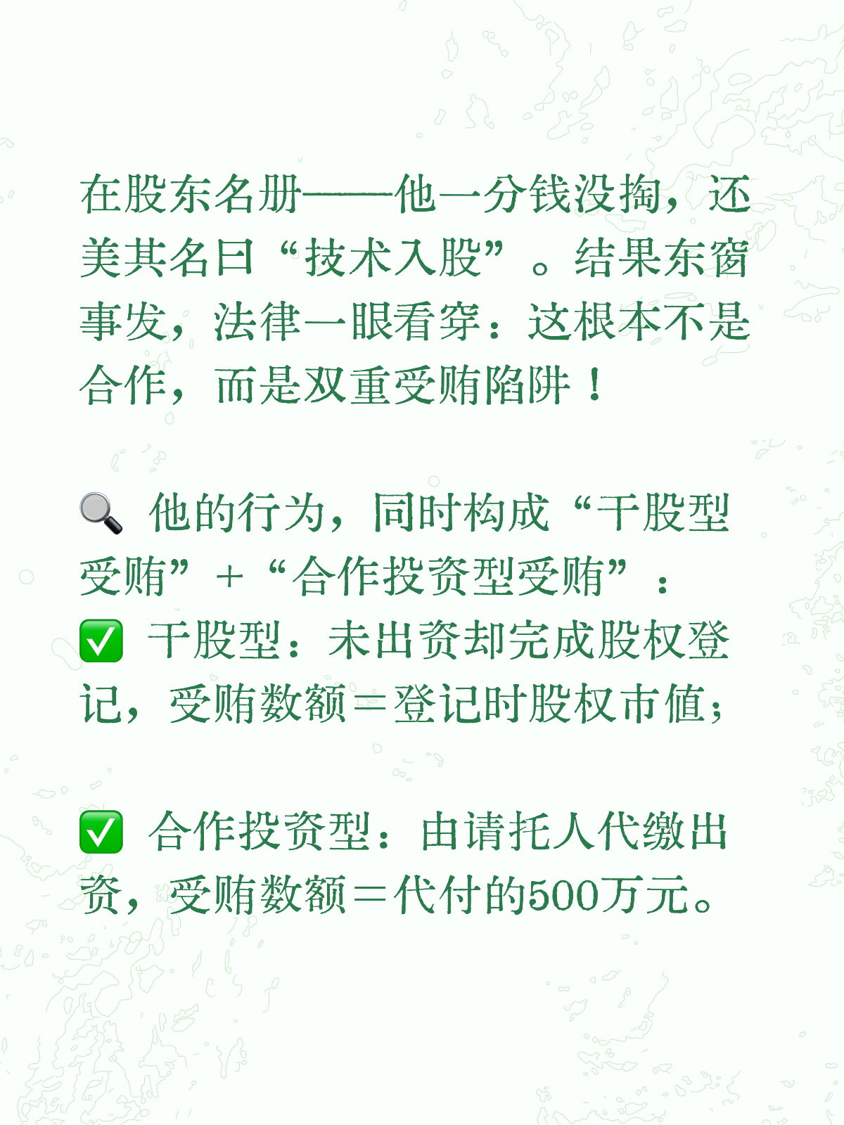 一纸未出资却登记在册的股权,竟同时触发“干股型”与“合作投资型”两类受贿罪名。本文解析司法实践中如何认定此类隐蔽权钱交易,揭示“技术入股”背后的法律风险。