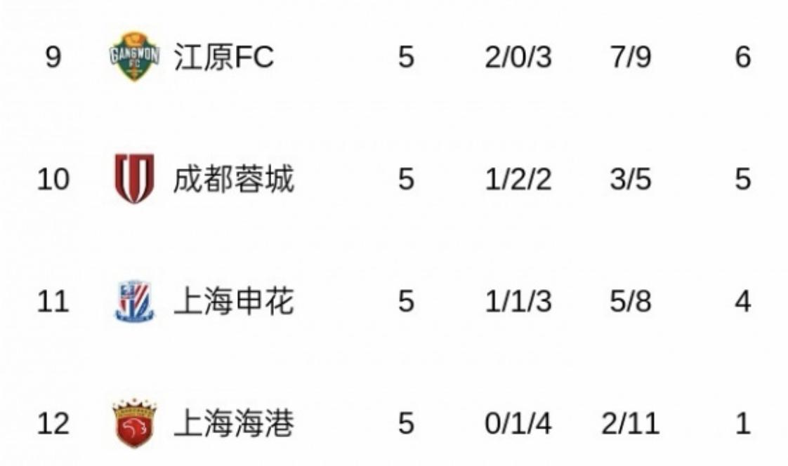 前4轮比赛,上海申花队取得1胜1平2负的成绩,积4分排名第10名,是中超3队中排名最高的。不过在11月25日晚进行的比赛中,成都蓉城队主场1-1战平了广岛三箭队,积分达到5分,升至第10名,上海申花队跌至第11名,也就是倒数第二名。