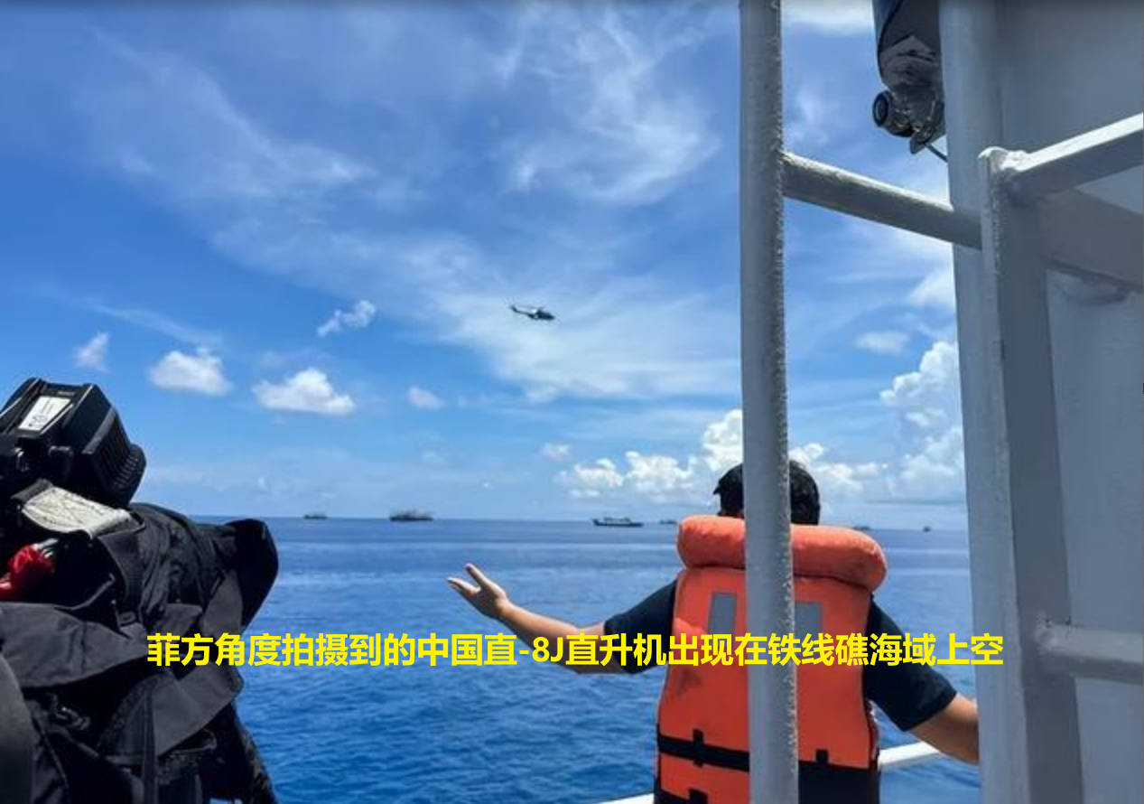 此外,闻讯从渚碧岛起飞的一架中国海军直-8J大型直升机,以极低空的飞行盘旋,呼啸声中裹挟着强大的气流,飞跃菲律宾渔政船的上空。这种强有力且威严的慑压态势,无疑对菲方船只构成了极为强烈的心理震慑。