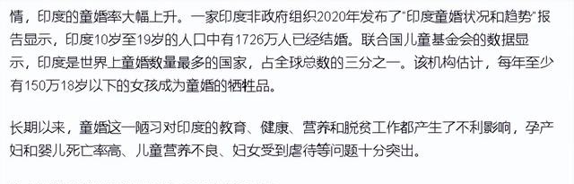 一家非政府组织2020年有一份报告显示,印度10岁到19岁的有1700多万人结婚,至少有150万未成年女孩,印度是世界上童婚数量最多的国家,约占世界的三分之一,童婚对印度的卫生,教育,脱贫等工作带来了很多难度。