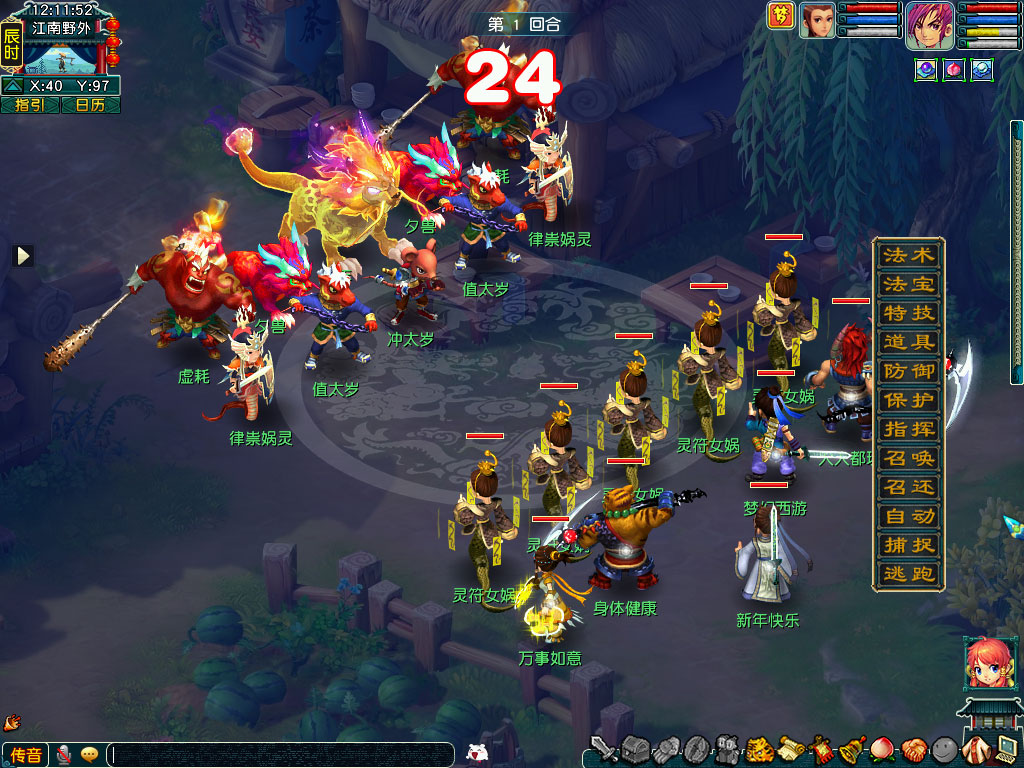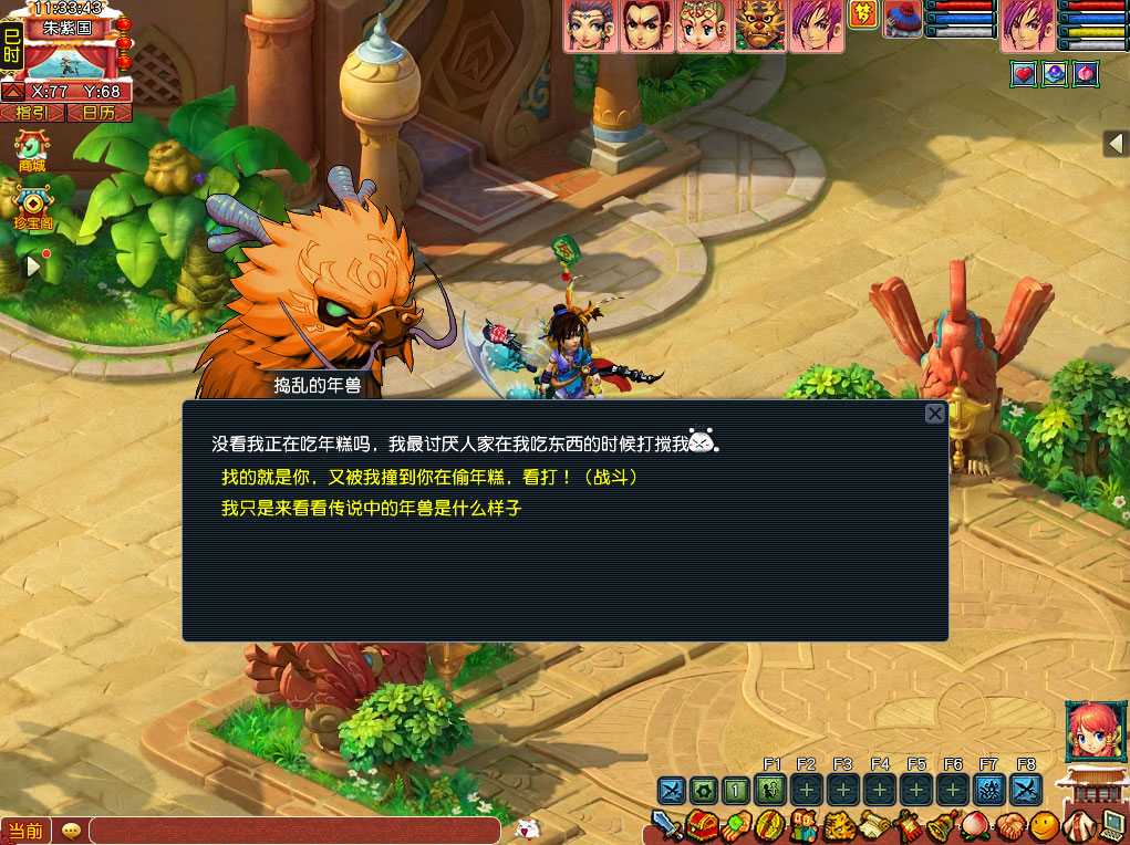 年兽玩法分两种,新手也能轻松上手:第一种是投放怪“捣乱的年兽”,每天整点10分、40分,会在8个场景中随机4个刷新,只要拾取“七彩烟花”(罗道人处5000两可买)就能挑战,无需复杂操作;击杀一定数量后会刷新大年兽,奖励翻倍!