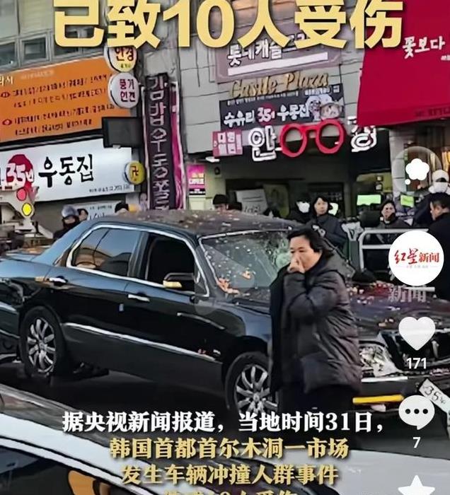 根据央视新闻报,当地时间12月31日,韩国首都首尔木洞,一家市场内发生了车辆冲撞人群的事件。