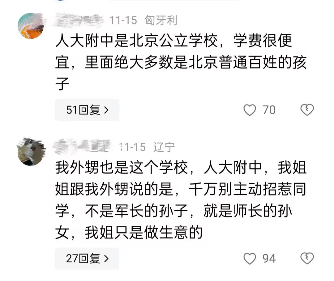 不过也有的网友表示,在人大附中就读的孩子背景很多都不一般,称不是军长的孙子,就是师长的孙女。其实,好的学校就这么几所,自然会吸引各路家长们的目光,碰到颇有背景的自然也是情理之中。