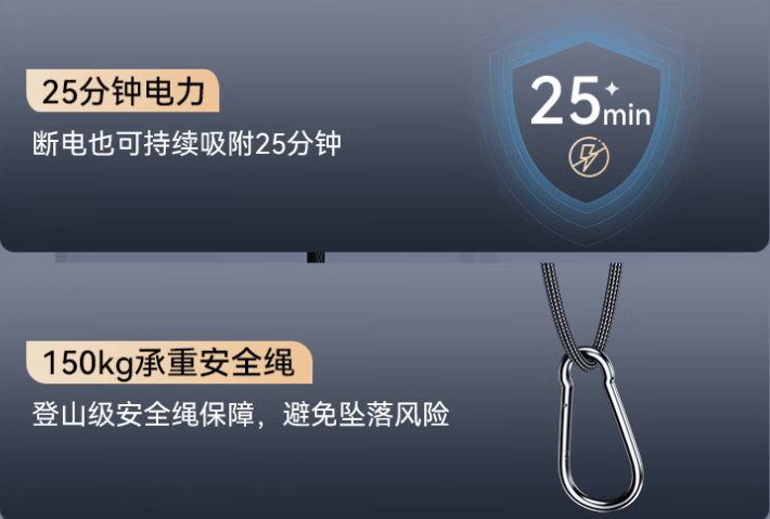 还有安全方面,它能精准进行边框探测,无框也能安全擦。它有着5300pa强大的吸力,能够牢牢得吸附在玻璃上。以及配备了攀岩级安全绳,承重100kg以上。万一出现断电或者异常情况,会发出警报提醒注意,断电之后它能保持25分钟强劲吸附,留出时间处理情况和续电。