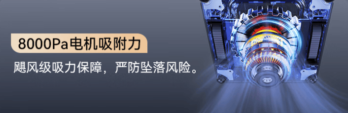 变频吸力上,3200Pa 变频吸力系统,自动调节吸力大小,既能稳固贴附,又能在不同玻璃材质上保持最佳吸附状态。