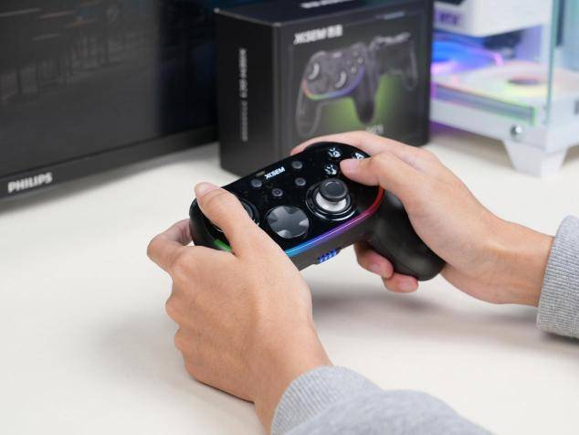 这款手柄采用的是Xbox的经典布局,握起来饱满但不笨重。随盒附带的RGB充电底座一亮,整套配置立刻有了电竞主机的感觉。底座下方还藏了一个小仓位,可以把2.4G接收器和备用的十字键帽直接塞进去,不用怕弄丢。机身的线条圆润,掌心贴合度高,长时间刷游戏不容易累。更重要的是,连接方式非常全:PC、Switch2、蓝牙、2.4G 都能直接用,APP 还能进一步调参数,无论放在哪个平台上都能马上进入状态。