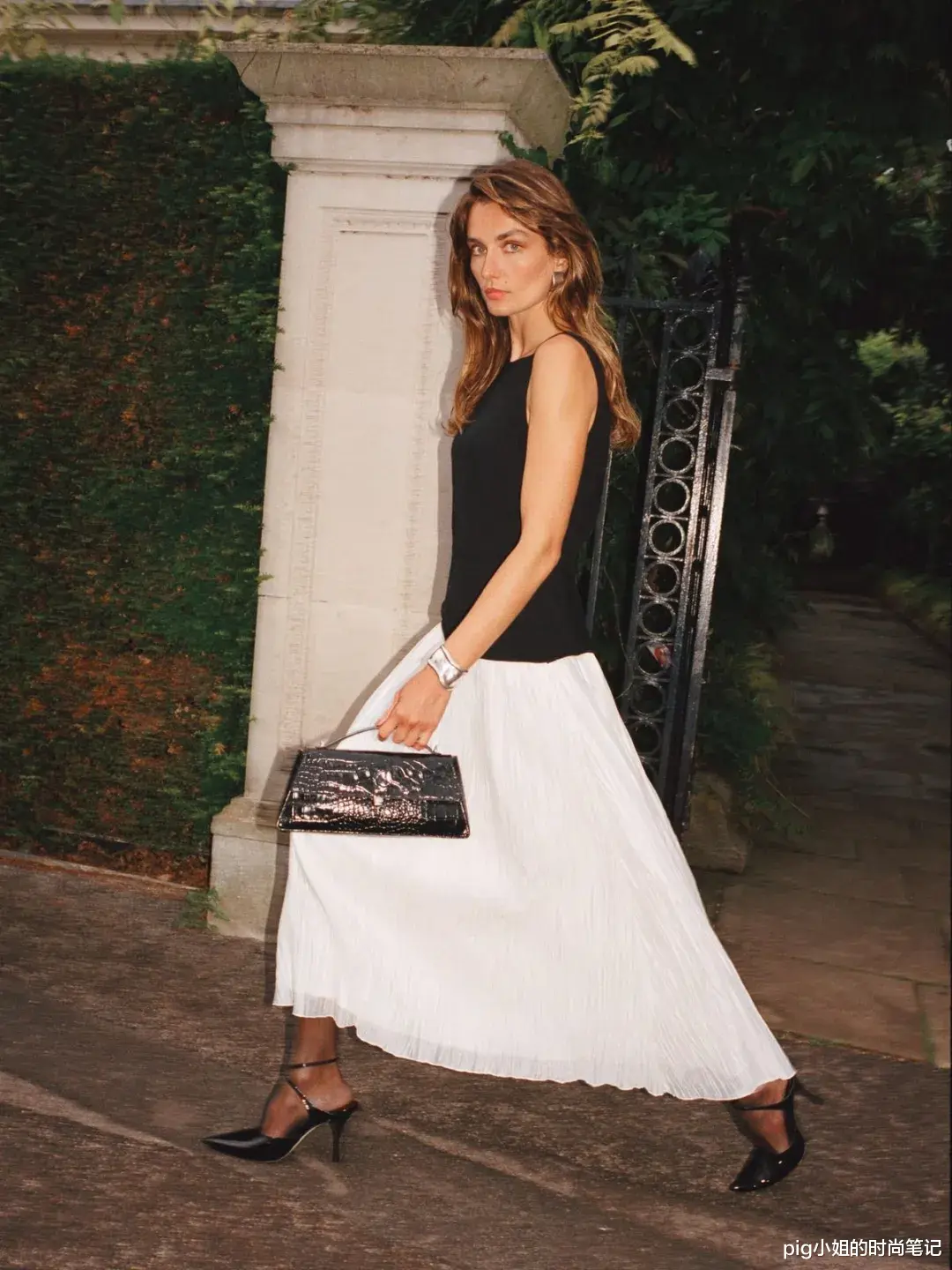 这样的搭配尤其适合肩颈修长的人穿;修身的背心能将轻盈感勾勒出来,大面积的裙摆与背心的相互呼应着,松紧间穿出优雅姿态。