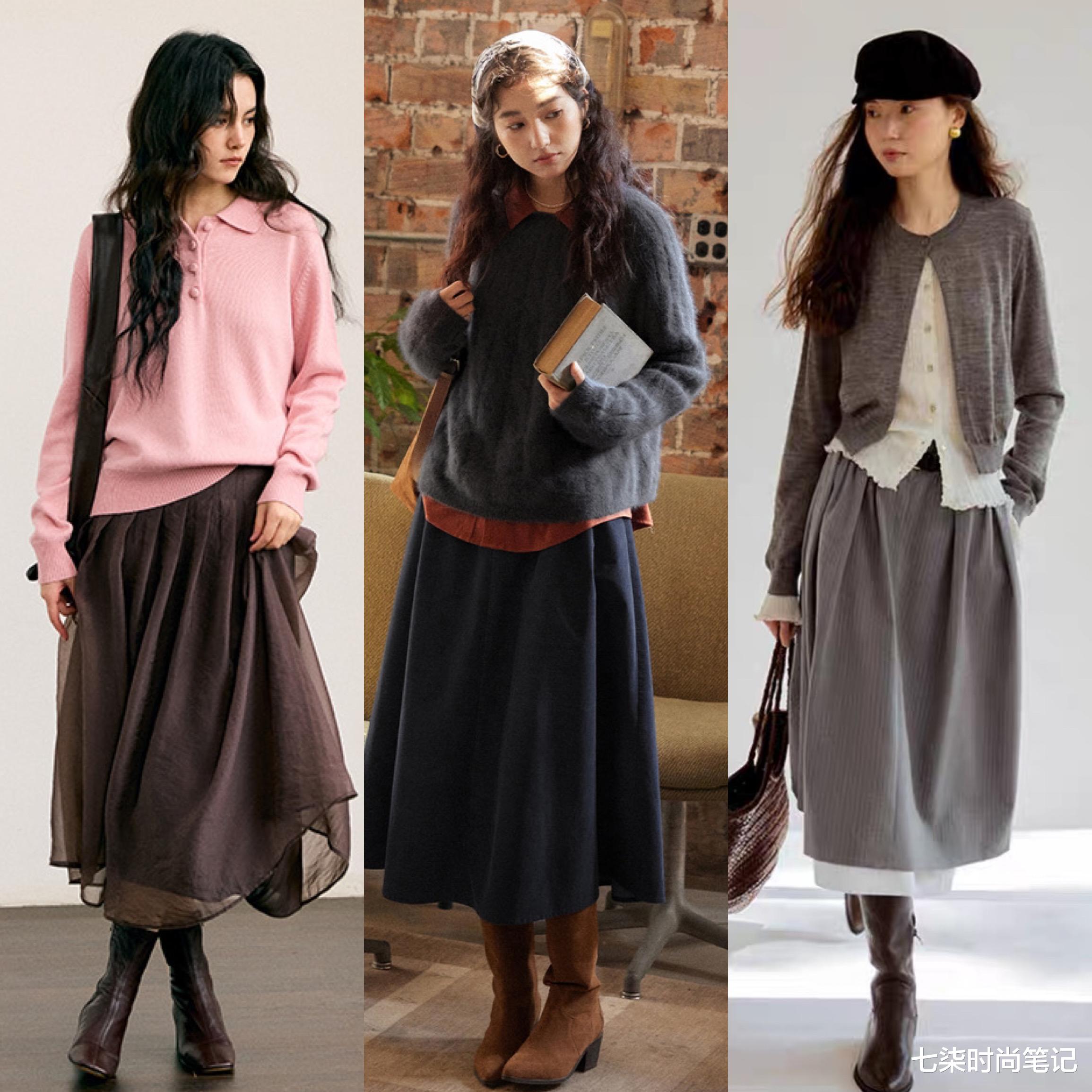 秋天,针织衫与伞裙的经典组合,搭配一双长靴,刚柔交织,为整体增添了干练飒爽的气质,温柔又不失个性。
