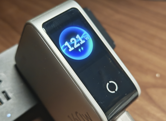 同时连接MagicBook16 Pro(C1口120W)、Magic8 Pro(C2口30W)、手机(C3口30W)、相机电池(C4口18W)、手表(A口5W),总功率稳定在121W+,笔记本充电速度和原装几乎无差,手机30分钟充至65%,全程充电器温度32-41℃,摸上去温热不烫手。数显屏实时显示各口功率,再也不用担心“大功率设备抢电”。
