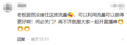 对此网友却有不同看法,认为老板居然没有接住这波流量,可以利用流量做得更好啊!干嘛关门,再不济就跟大家一起开直播嘛。