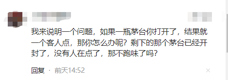 还有位网友则质疑茅台酒的味道,他来说明一个问题,如果一瓶茅台给打开了,结果就一个客人点,那这老板怎么办呢?剩下的那个茅台已经开封了,没有人在点了,那不跑味了吗?