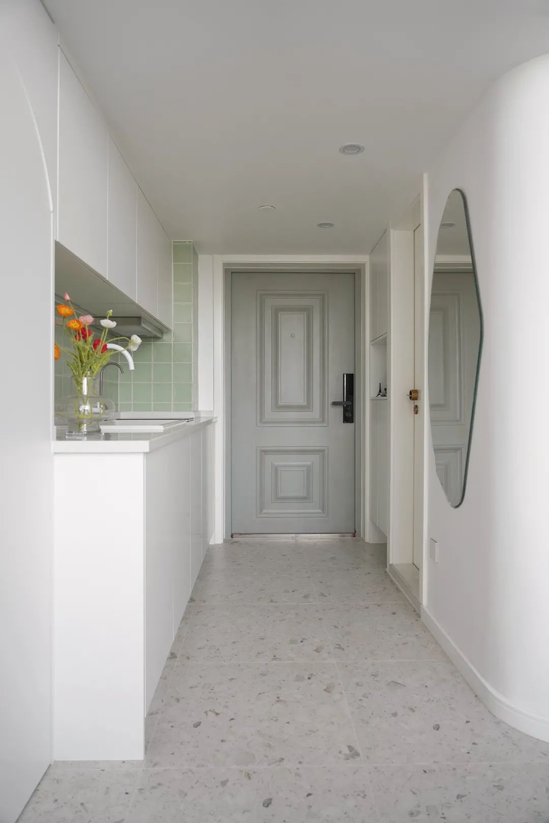 【进门就被惊艳到】 玄关顶天立地鞋柜藏玄机!柜体中部和底部留空,随手放钥匙包包,常穿鞋不用翻找。右手边定制一字型橱柜,浅绿小方砖+白色柜门清新到冒泡,进门就像进森林氧吧!