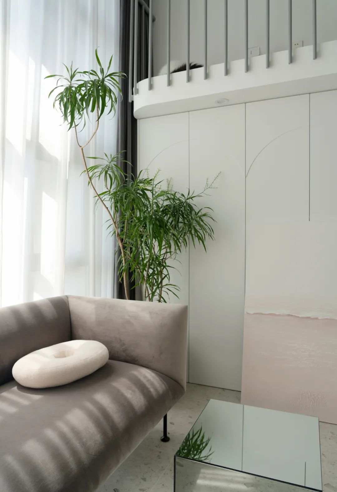 【客厅:挑高空间玩出新高度】 复古绿+浅灰撞色超显贵,大株绿植点缀宛如森林氧吧!整面落地窗+白色纱帘拉升层高,阳光洒进来瞬间小户型变通透。折叠餐桌椅太绝了!不用时收起来秒变宽敞客厅!