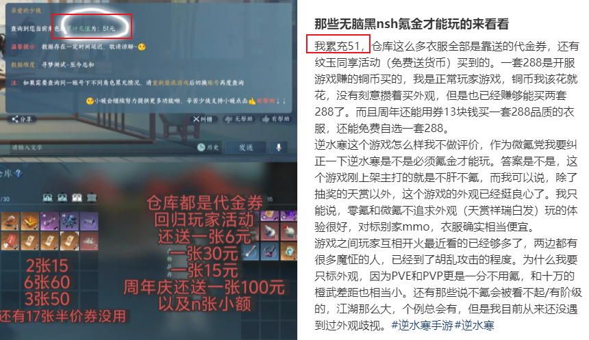 嘿,结果您瞧咋样?这位女生真就晒出了自己的累积充值记录,上面清清楚楚写着充值金额为51元,还真没花钱呢!