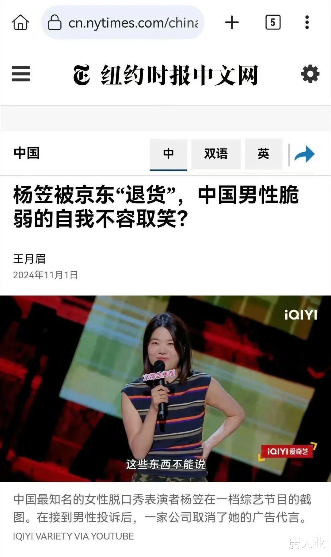 登上《经济学人》版面之后,大名鼎鼎的《纽约时报》也紧跟其后文力挺杨笠,声称中国男性很脆弱,不容取笑。