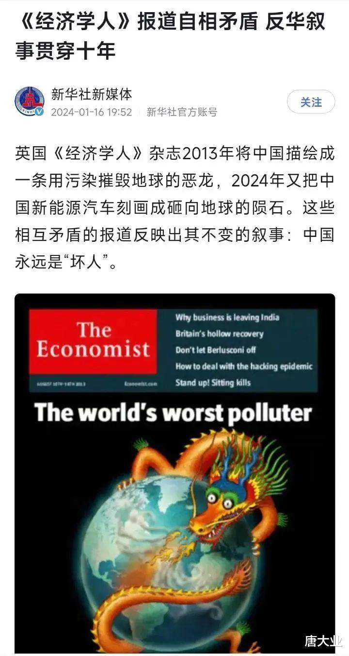 新华社曾在今年1月16日发表文章,谴责《经济学人》报道自相矛盾,反华叙事贯穿十年。