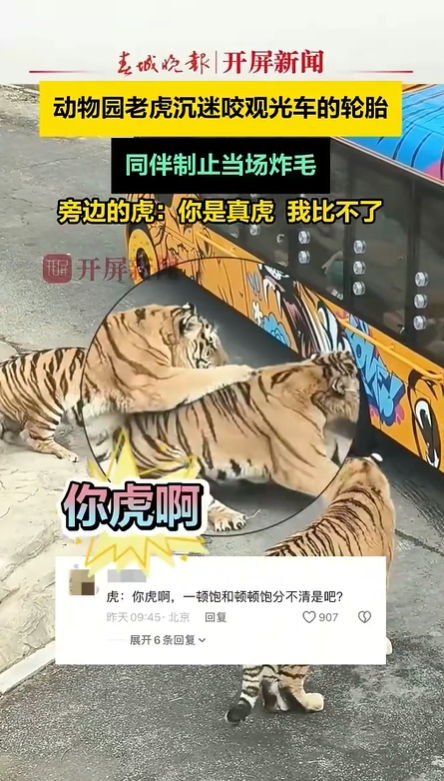 近日,辽宁某野生动物园上演了一场惊心动魄又颇具戏剧性的场景:一只东北虎突然袭击观光车轮胎,正当危险升级时,令人意外的是,另一只成年老虎挺身而出制止了这一危险行为,而被制止的老虎竟当场"炸毛",展现出野生动物复杂的社会行为。