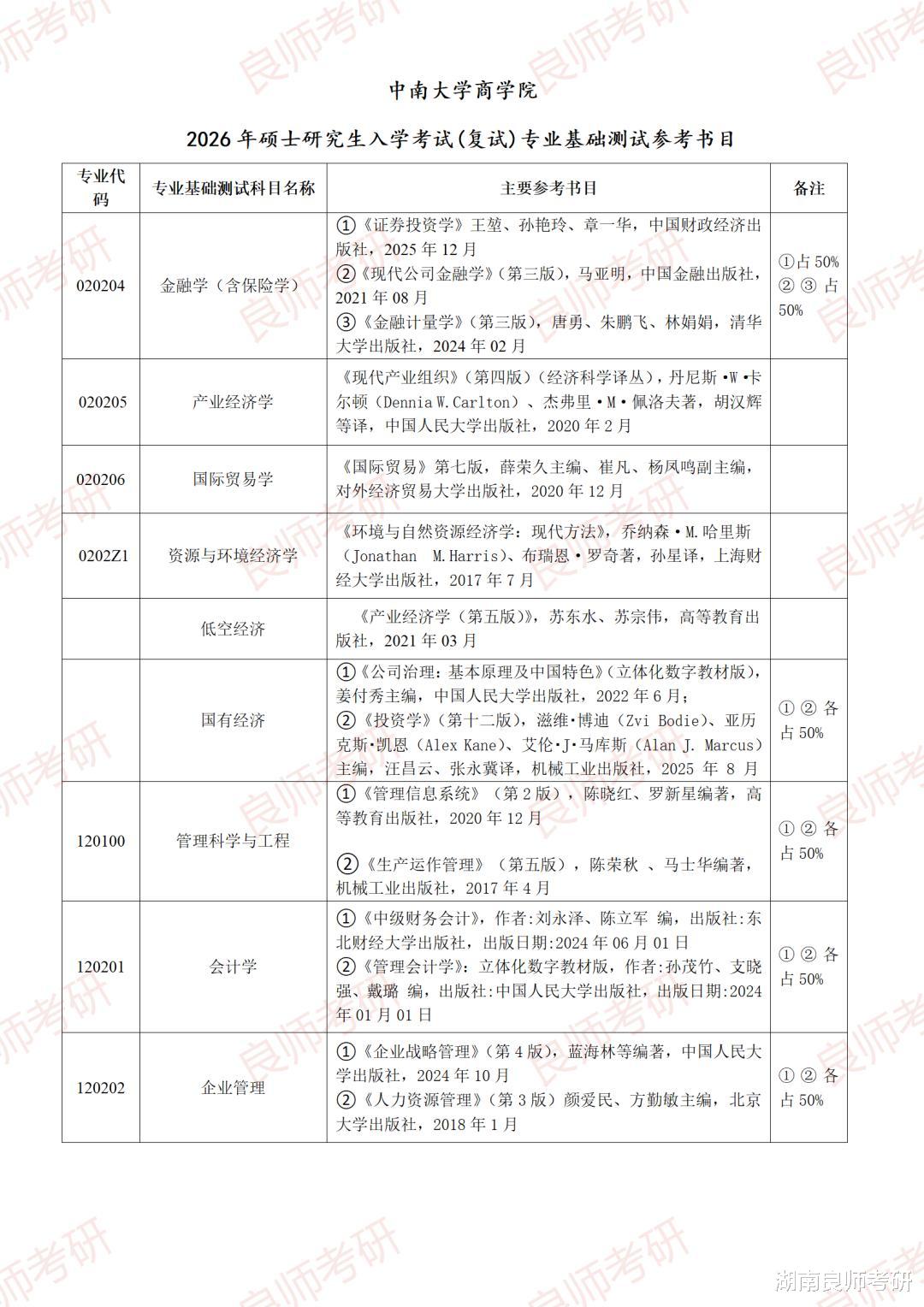 中南大学商学院发布了《中南大学商学院2026年硕士研究生入学考试(复试)专业基础测试参考书目》。