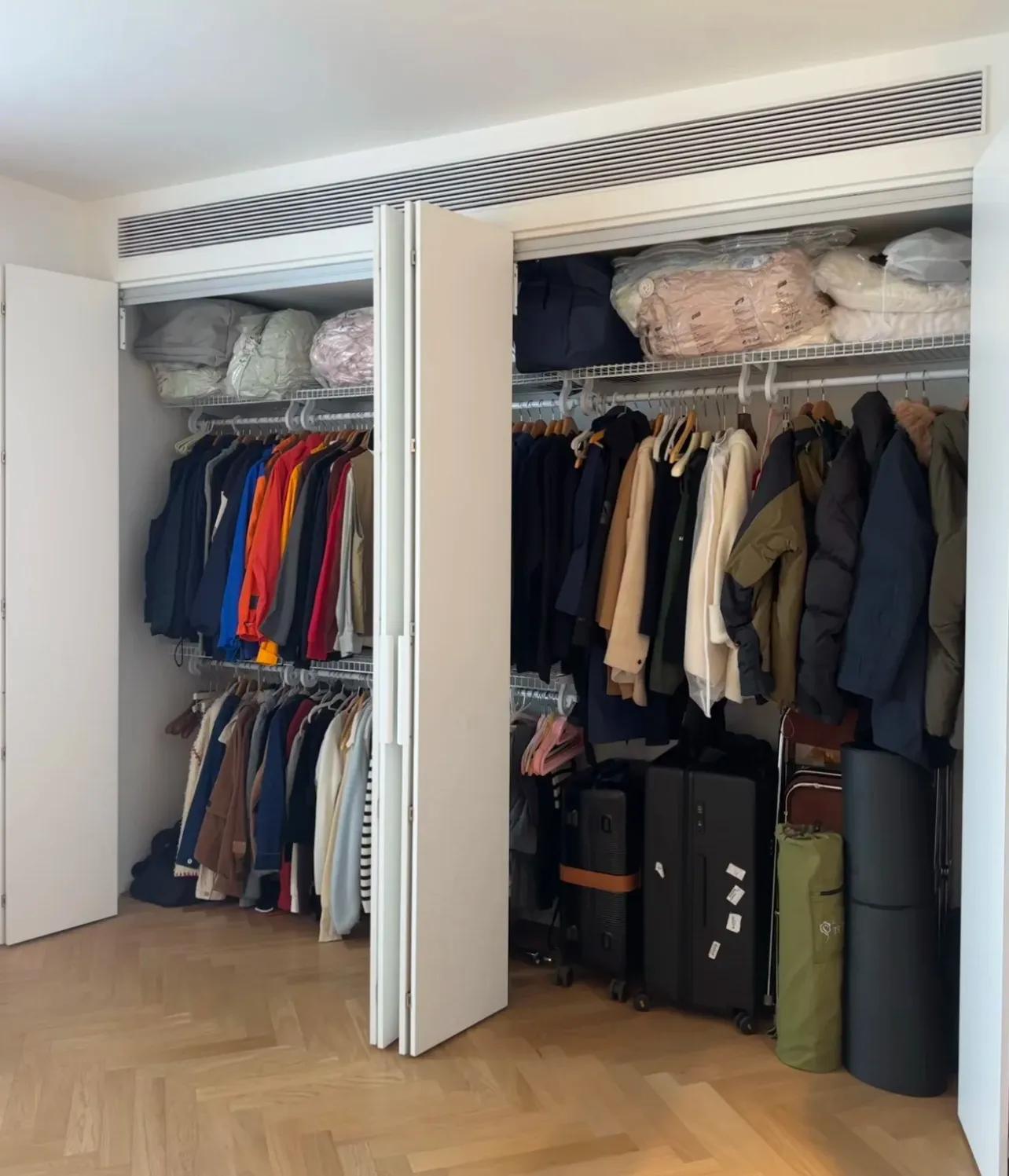 7、单挂杆壁橱或许壁橱里面连置物隔板也不要,就几个挂杆来实现全部挂衣需求。