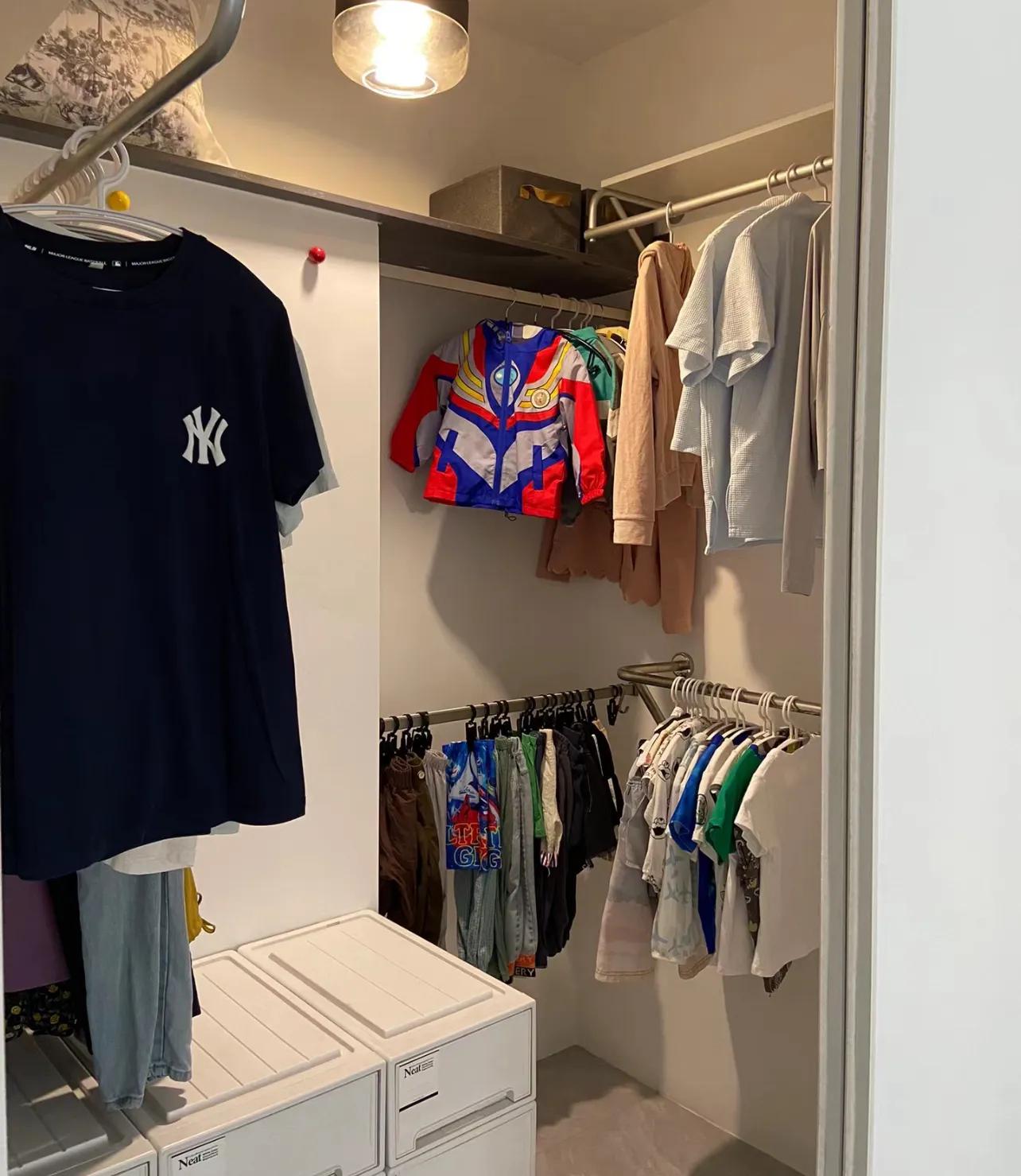而且,货架衣柜有两个特性,一是它便宜,二是它放的越多越稳固,这对衣服多,预算还有限的家庭来说,是非常不错的一个选择。