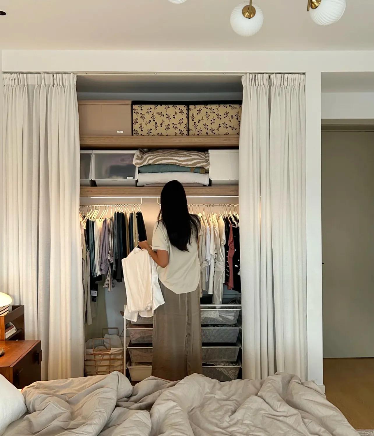 3、货架衣柜+搭配防尘帘有人会觉得货架衣柜的方案很好,但问题是不防尘。