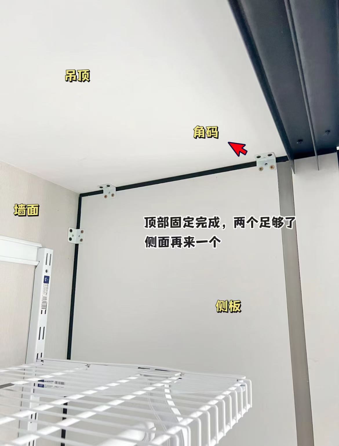 角码的具体固定方式,可参考下图,在衣柜内侧,上面、侧墙分别固定,固定好的侧板稳固性,一点也不比木工板差。