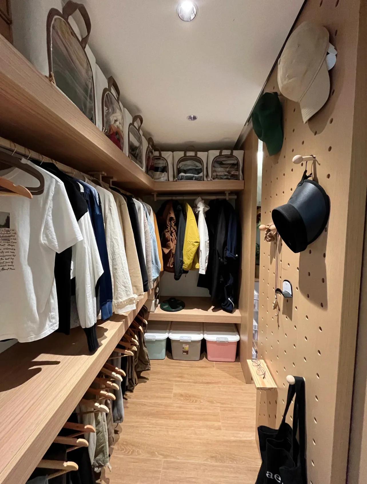9、层板挂杆衣帽间+洞洞板如果家里有一块空间,可以用来做衣帽间。