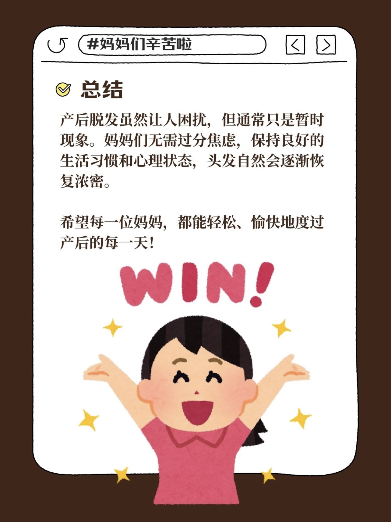 产后脱发虽然让人烦恼,但只要我们了解原因,采取正确的应对方法,就一定能度过这个头发危机”,让头发重新焕发生机,新手妈妈们,别焦虑啦,你的头发会回来的,让我们一起用满满的爱心和耐心,迎接更加美丽自信的自己!