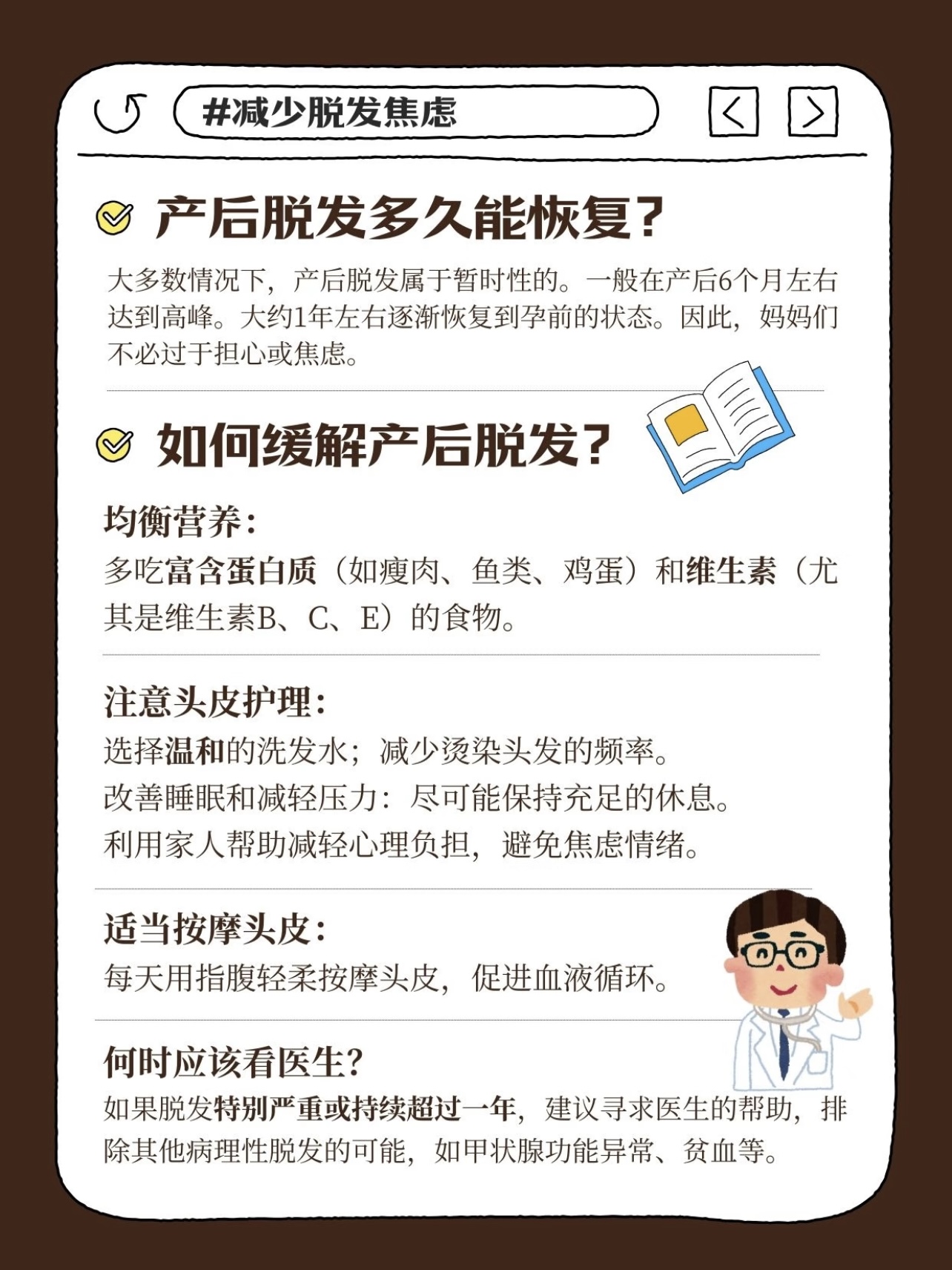 挽救头发,这几招超管用!放松心情,别给自己太大压力,产后脱发是很多妈妈都会经历的正常生理现象,一般会持续3-6个月,之后头发就会逐渐恢复正常生长,所以,新手妈妈们别太焦虑,要学会调整自己的心态,保持乐观的心情。可以和家人、朋友多聊聊天,分享一下育儿的经验和感受,也可以听听音乐、看看电影,让自己放松放松,就像给心情放个假,让它也能喘口气。合理饮食,产后饮食要均衡,多吃富含蛋白质的食物,如鸡蛋、牛奶、鱼肉、豆类等,这些食物是头发的重要组成部分,能为头发的生长提供充足的原料,还要多吃富含维生素和矿物质的食物,如新鲜的蔬菜、水果、坚果等,它们能促进头发的新陈代谢,让头发更健康,比如菠菜富含铁元素,能预防缺铁性贫血,对头发也有好处;核桃富含不饱和脂肪酸,能让头发更有光泽。洗头的时候,要选择温和的洗发水,避免使用刺激性强的产品,水温也不要太高,37℃-40℃为宜,太热的水会损伤头皮和头发。洗头时用指腹轻轻按摩头皮,促进血液循环,但不要用指甲抓挠,以免损伤头皮,洗完头后,尽量自然晾干,如果要用吹风机,不要离头发太近,温度也不要太高。平时梳头的时候,要选择宽齿的梳子,从发梢开始梳,慢慢梳到发根,避免拉扯头发。