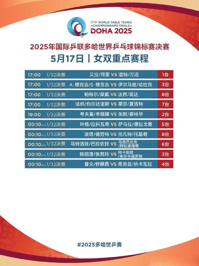 女单方面,孙颖莎将在5月17日18点20分左右出场,陈幸同也将在5月17日迎来自己的首轮比赛。
