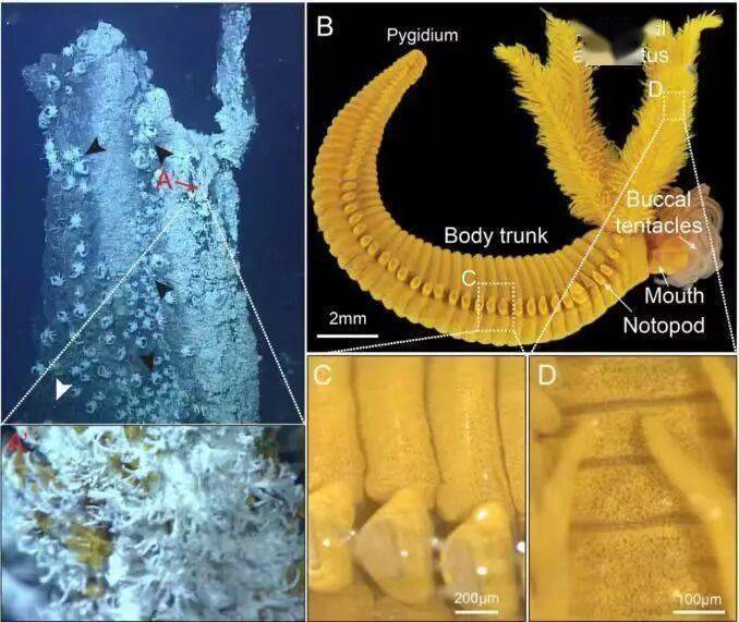A:贺氏拟阿尔文虫生活的深海热液烟囱,其中A’显示热液喷口附近的贺氏拟阿尔文虫群落;B:贺氏拟阿尔文虫个体;C和D:贺氏拟阿尔文虫躯干及头冠皮下表的亮黄色颗粒。