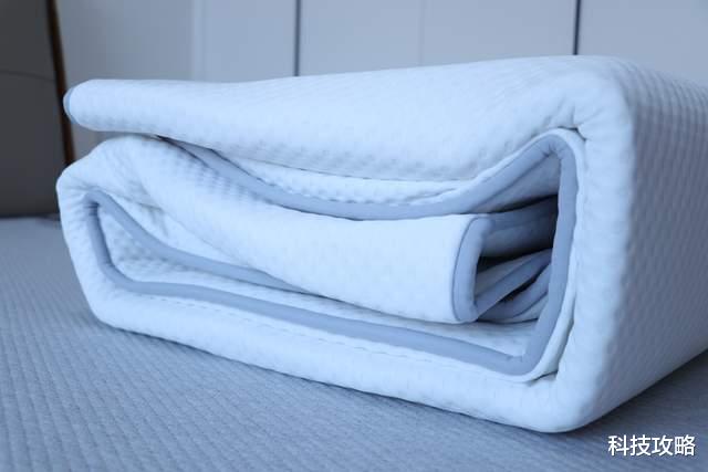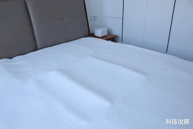 相比于电热毯,水暖毯在毯体体积上肯定会略大一些,毕竟电线很细,而水暖毯内部拥有水管,自然体积会略厚一些。不过水暖毯虽然内部有水管,但当你躺上去的时候内部水管不会有那种凹凸感。毕竟这款水暖毯毯体由亲肤层、硬质棉、PVC软管、胶衬固定层、防滑滴塑布组成,不仅摸起来亲肤,躺在上面也会感觉很柔软。