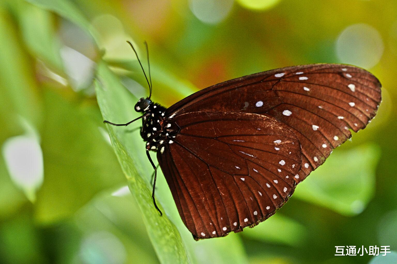 拍摄了一张蝴蝶停在树叶上休息的照片。我们把注意力集中在蝴蝶的复眼上,这个镜头能够准确地捕捉到主体,包括羽毛和鳞片褪色的外观。