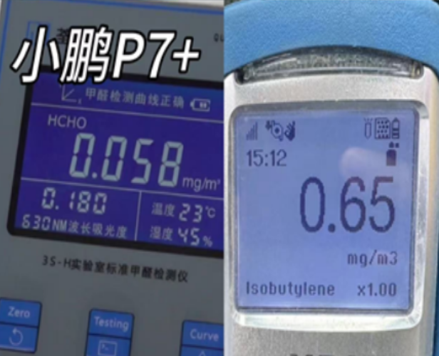 然后看看小鹏P7+。在座舱用料方面,小鹏P7+没有采用特殊健康材质,其地板中的甲醛释放量测量数值为0.126毫克每立方米,座椅甲醛释放量为0.017毫克每立方米,顶棚中甲醛释放量为0.026毫克每立方米,车内空气TVOC释放量测量数值为0.65毫克每立方米。对于有小孩或孕妇的家庭来说,建议多注意一下车内清洁。