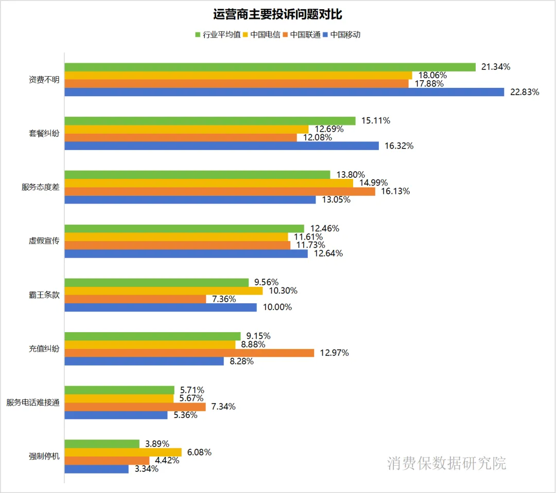 从通信行业主要投诉问题来看,资费不明(21.34%)、套餐纠纷(15.11%)、服务态度差(13.80%)成为投诉重灾区。