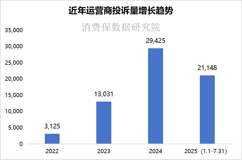 2025年截至7月31日,消费保平台三大运营商相关投诉已达21,148件,已逼近去年全年总量,涉诉金额超2396万元。